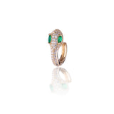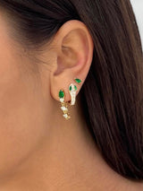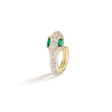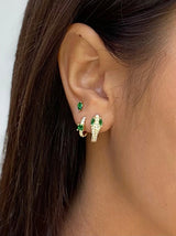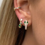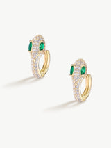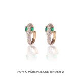 Embrace your wild side with choosebyfelice Snake Huggie earring, expertly crafted in the shape of a dazzling snake fully set with white zirconia stones and two green "eyes made of zirconia stones ald set in glowing 14ct gold plating This beauty is absolutely breathtaking to behold. It's a unique must-have that livens up any outfit, especially when worn as a pair with our bestselling Snake with cuff earring.