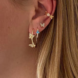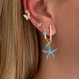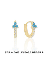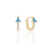 An essential piece for when you want subtle sparkle, our beautiful Jamie Huggie Earring. Adorned with 3 turquoise semi-precious stones and sparkling zirconia stones, this fine hoop earring perfectly hugs your ear. It's a must-have for everyday wear, whether you wear it alone or combined with a few other hoops or studs for a trendy look. .Also available in Emerald Green and Pink.