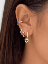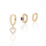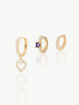 Channel your inner love for style with choosebyfelice Triple heart earring set, featuring a lovely heart pendant which is adorned in sparkling CZ stones that dangles splendidly from a bedazzled huggie hoop earring combined with one small hoop set with a dazzling lavender cubic zirconia stone and one small pavé stones hoop shape, that hugs the ear. We call it an irresistibly sweet stack of style that will beautify your ears.