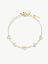 Elevate your bracelet look with our beautiful Lovely Hearts Bracelet, a flawless blend between chic and timeless glam, making it a versatile accessory for every day. Featuring 2 shining round zirconia stones & 3 fine golden hearts, set into a fine chain with cute dots all set with our signature waterproof 18ct gold plating that won't ever lose it's color! Order your Lovely Hearts Bracelet now.