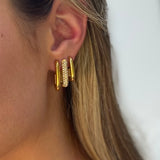 Deze oorbellen zijn gemaakt van een roestvrijstalen basis die is ondergedompeld in een bad van 14K goud. Dit betekent dat het niet vervaagt, waterdicht en hypoallergeen is.