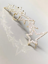 Deze glamoureuze oorbelset is aan de ene kant voorzien van: vijf 14K goud vergulde en met kubieke zirkonia stenen versierde sterren die zich om je oor wikkelen en aan de andere kant een stijlvolle enkele ster stud oorbel. Je hebt maar één oorlelgaatje per oor nodig. Ook verkrijgbaar in zilver.