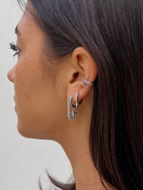 Geef een sprankeling aan elk earparty met de door Felice gekozen "Daisy Ear Cuff" met een rij kristalheldere zirkonia-stenen en twee rijen gedraaide verzilvering. Voor deze ear cuff heb je geen piercing nodig, je schuift hem gewoon over het oor. Het bestaat ook met goud plating en goud met zwarte stenen.