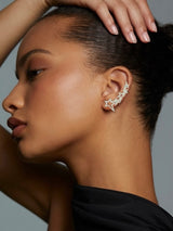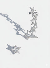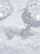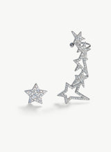 This glamorous earring set is featuring on one side: five platinum plated and Cubic Zirconia stone adorned stars that wraps around your ear and on the other side a single star stud earring. You only need one earlobe hole per ear. Also Available in gold.