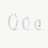 Beautify your ears with choosebyfelice triple pavé huggie earring set, featuring 3 classic hoop earrings that hugs the ear in the sizes 12mm & 10mm and 8mm, all set with white cubic zirconia stones all around. These beauties will instantly give you that eye-catching effect and are perfect for every day wear! Get your pavé earring set now in gold or silver.